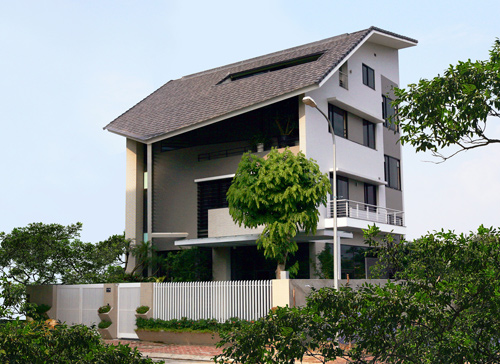 Nằm trong khu đô thị mới ở Cầu Giấy (Hà Nội), ngôi nhà được xây dựng trên khu đất vuông vắn nhưng lại có điểm bất lợi là nắng nóng do mặt tiền hướng chính Tây.